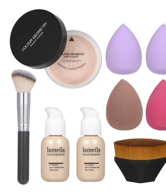 Perfect starter makeup kit that includes Eyeshadow Palette, Lip Gloss, Lipstick, Liquid Foundation, Mascara, Eyebrow Pencil, Eyeliner, Contour Stick, Powder Puff, 5pcs Makeup Brushes Set, Cosmetic Bag.